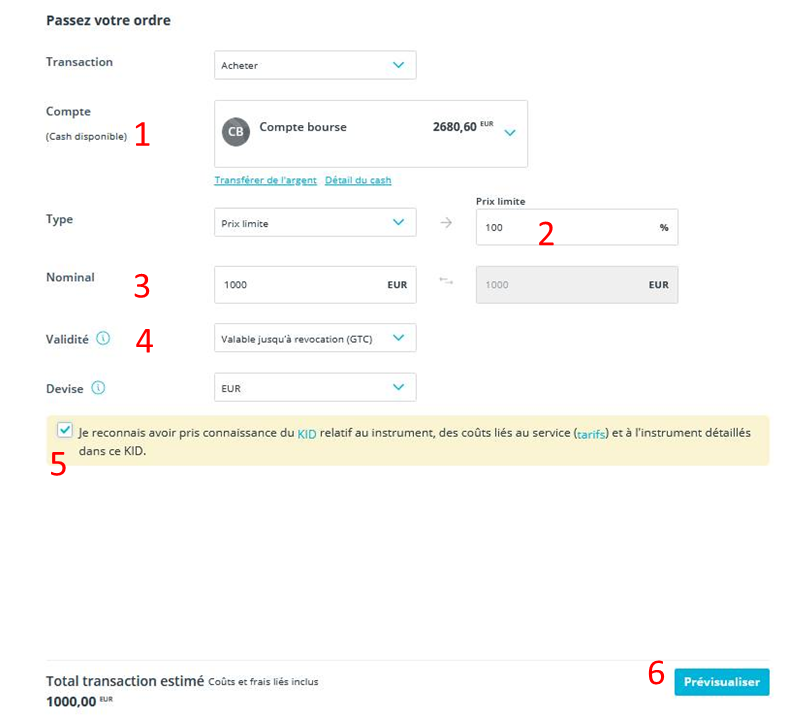 - Sous « Nominal », indiquez le montant que vous souhaitez investir. Attention, ce montant doit être un multiple de 100EUR . (Dans l’exemple, nous avons indiqué 1000EUR )