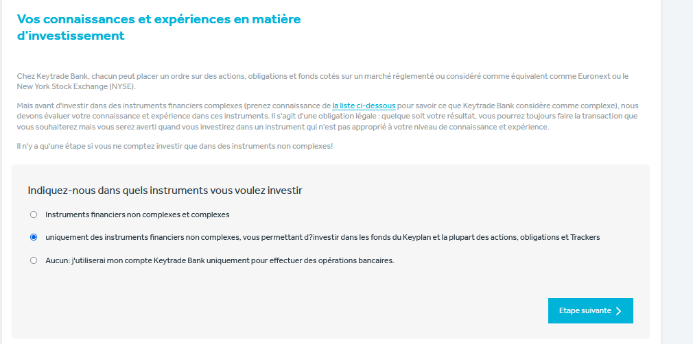Vous devriez aussi déjà avoir rempli le « test de connaissance et d’expérience ». Si ce n’est pas le cas, vous pouvez le faire via notre site transactionnel. Vous trouverez ce test sous Préférences