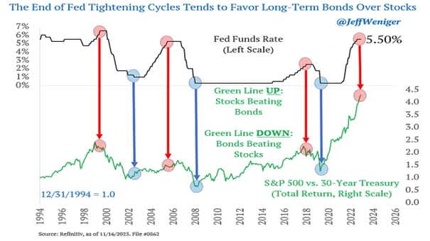 Regardez les derniers mois. Du mois d’août à la fin octobre, la plupart des bourses ont reculé d’environ 10 % ou plus parce que la politique monétaire américaine sévère ne semblait jamais devoir prendre fin. Mais début novembre, la banque centrale américaine (Federal Reserve ou FED) a déclaré qu’une pause monétaire allait arriver et les cours des actions sont subitement partis à la hausse.